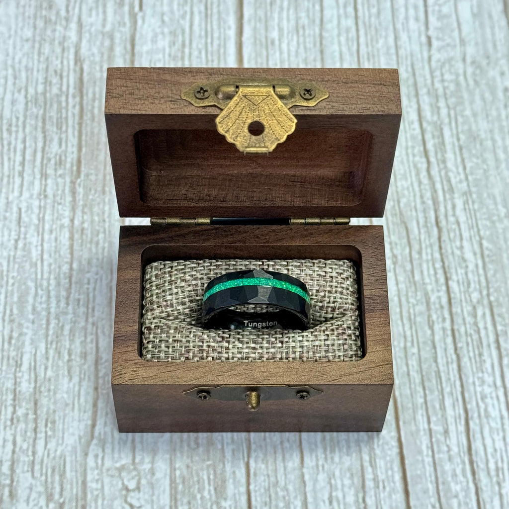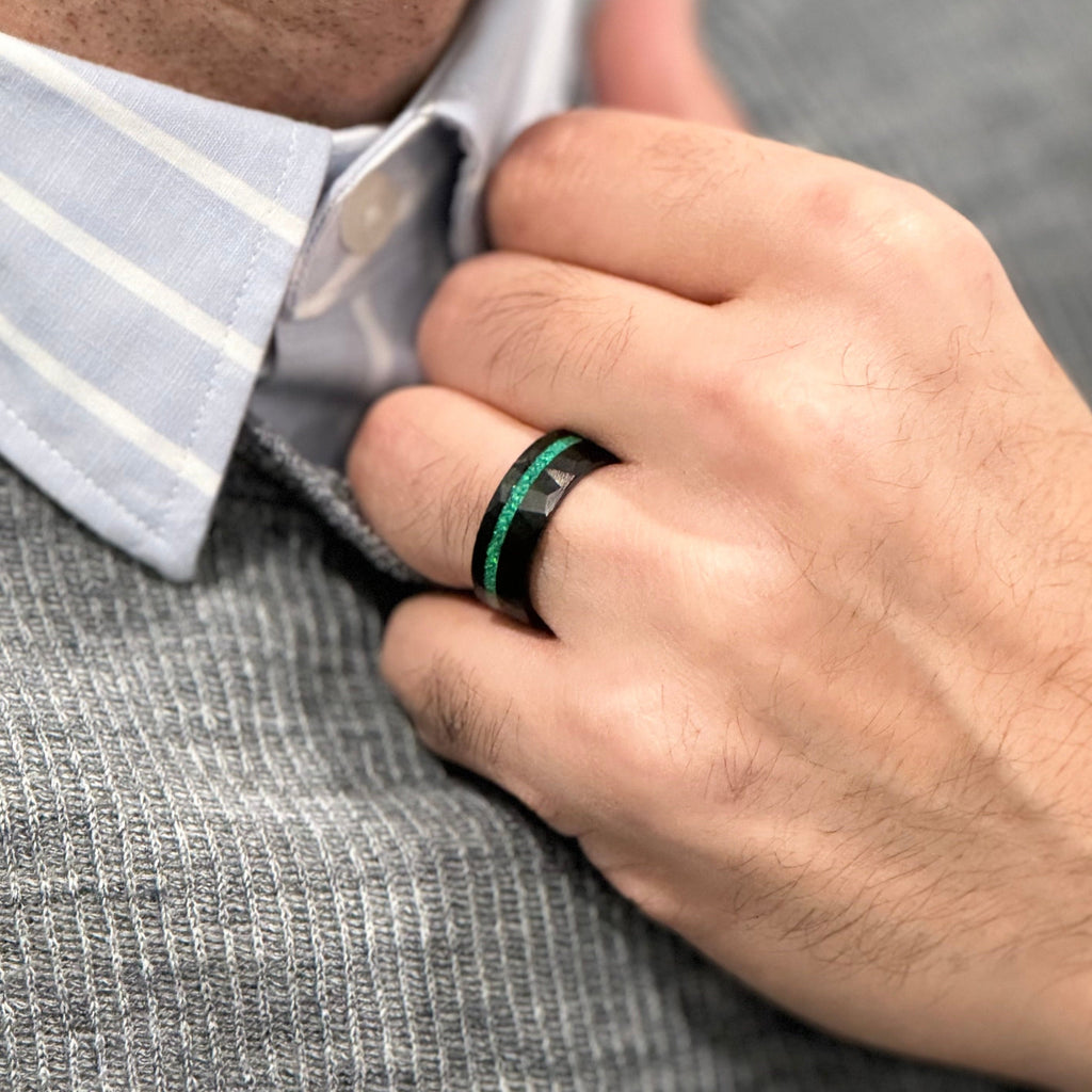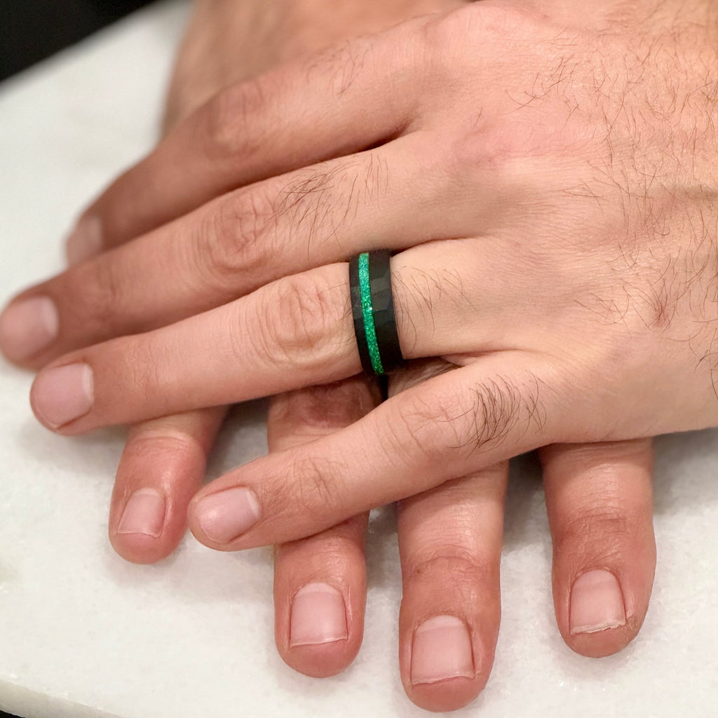 Introducing our Tungsten Carbide Black Hammered Ring with Green Opal, showcasing a distinctive hammered texture and an inset of vibrant green opal set asymmetrically. This 8mm-wide ring can be customized to any size, including those not listed above; contact us for personalized orders!